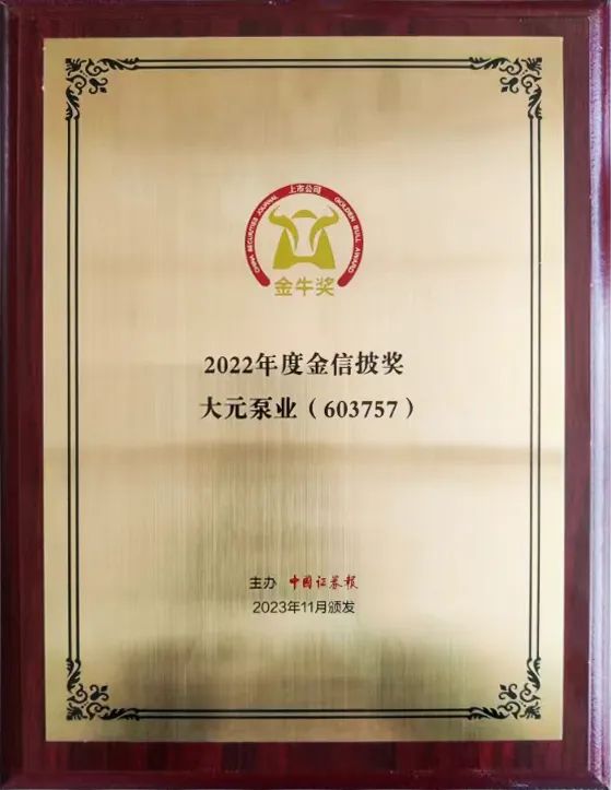 自2017年上市以来,大元泵业坚持以规范运作为基础,严格遵守法律、法规及规范性文件的要求,不断强化信息披露的规范性,提高公司的治理水平。公司采用丰富多样的投资者沟通渠道优化投资者关系管理工作,始终坚持聚焦主业发展,奉行与投资者共同发展的长期主义。公司本次荣获第25届上市公司金牛奖“金信披奖”,也彰显了资本市场对公司规范治理、信息披露以及投资者关系管理工作等工作的充分肯定。未来,公司将持续提升核心竞争力,推动治理和经营能力进一步发展,以期为投资者带来长期稳健的回报。