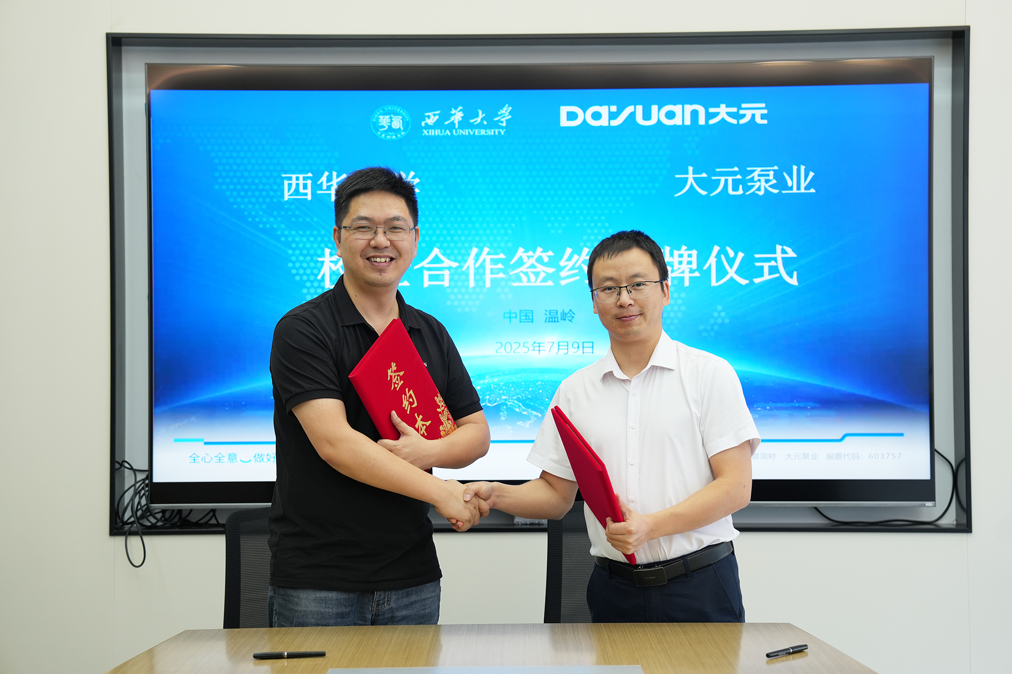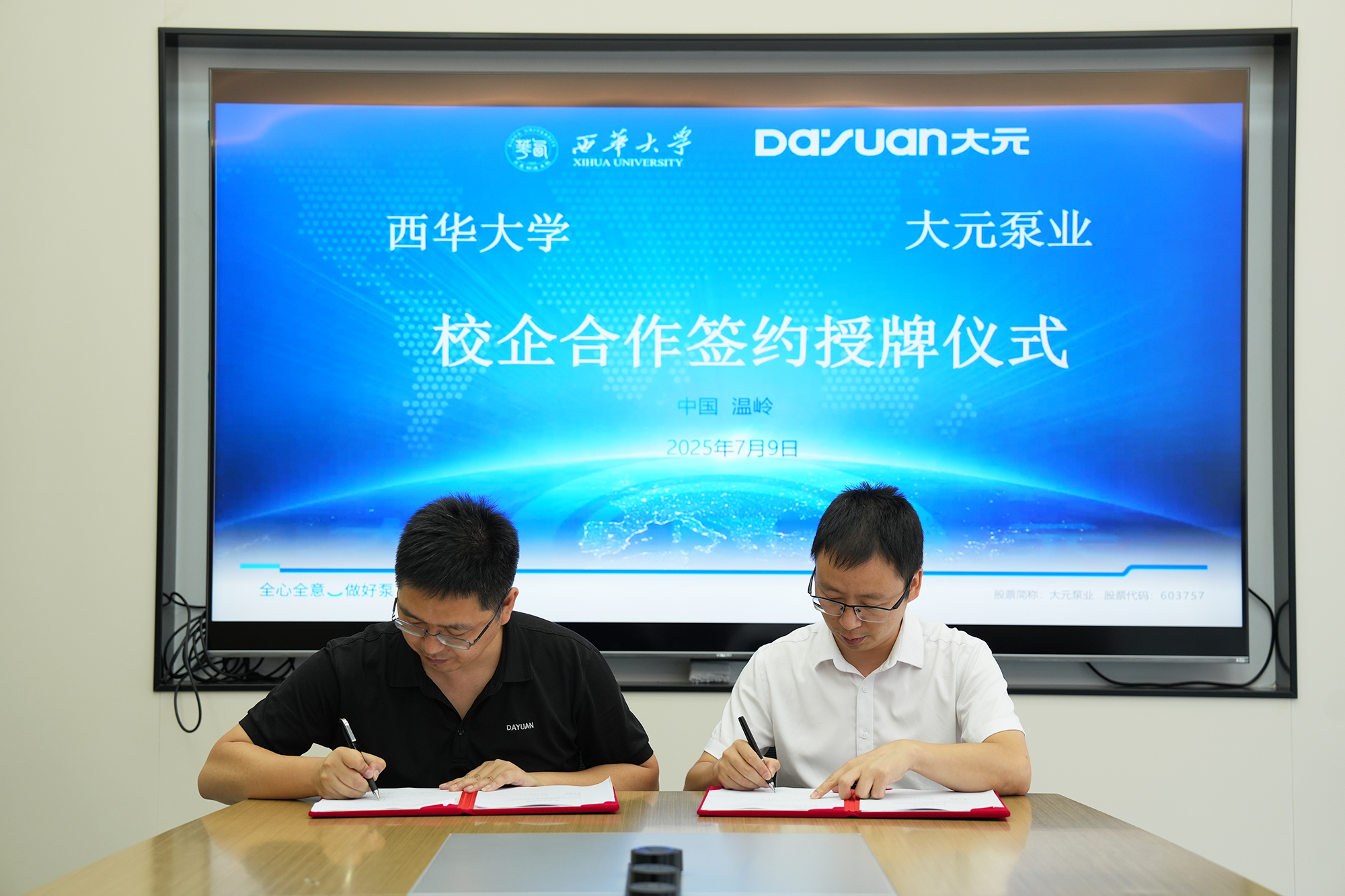 ▲大元泵业西华大学双方代表签署《校企合作框架协议》