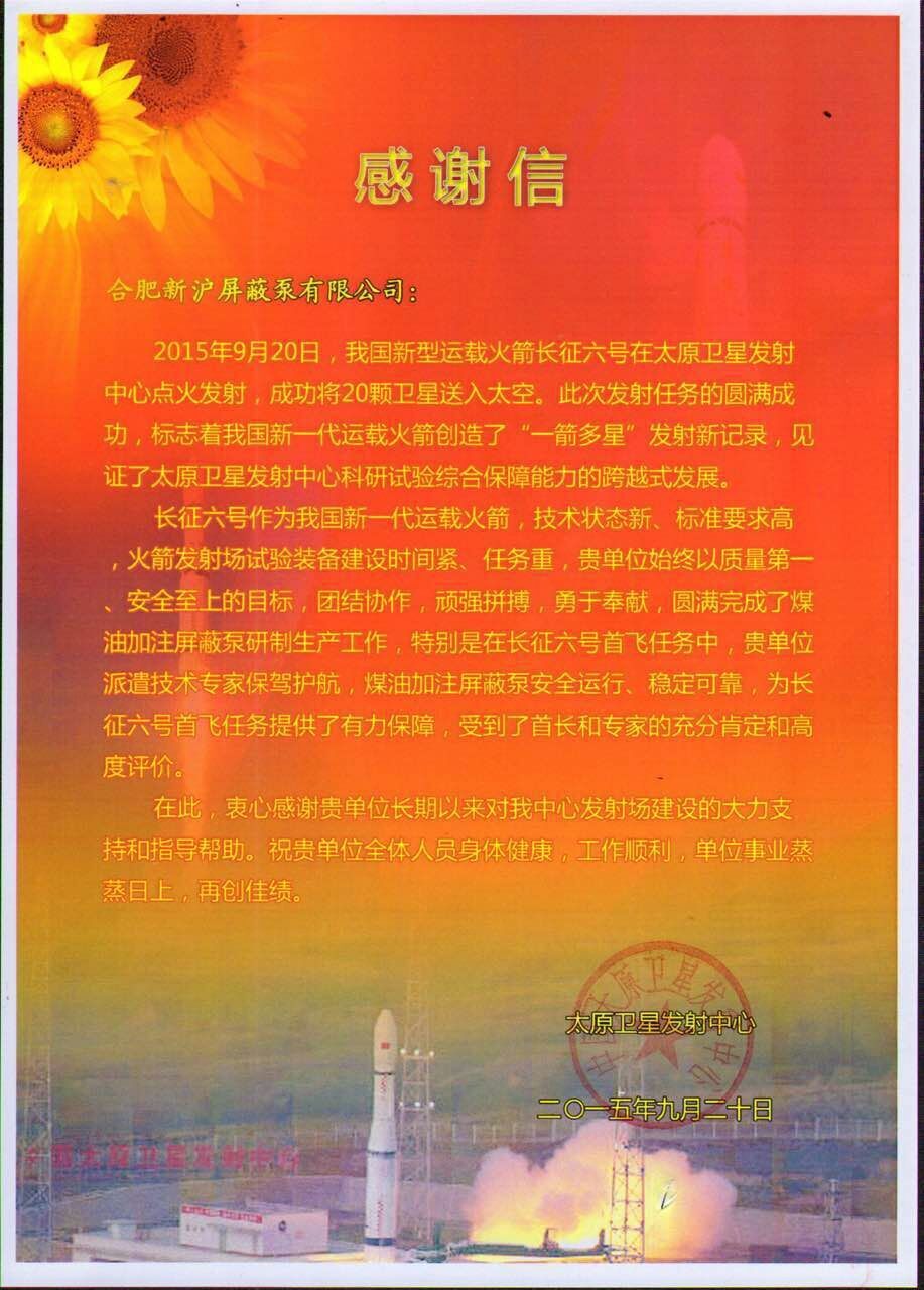 我公司下属子公司合肥新沪屏蔽泵有限公司得到太原卫星发射中心的感谢