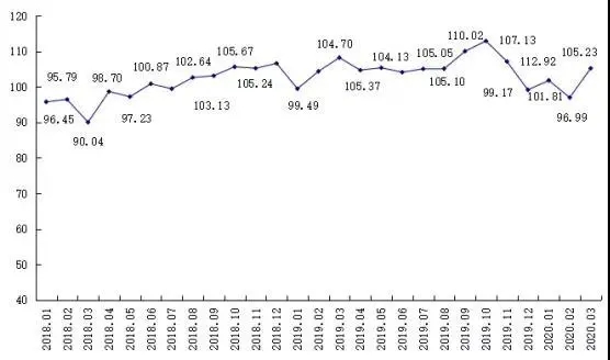 根据海关的商品分类与统计数据,2020年3月出口混合均价总指数现阶段呈现上升趋势。出口混合均价环比上升了8.24点,同比下降了2.99点,指数值为105.23点;具体可见图2。