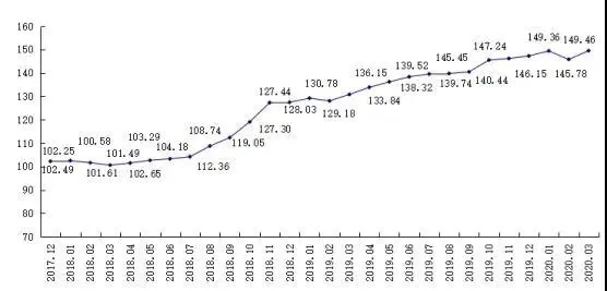 根据指数监测样本单位的出口销售情况,按照与生产企业相同的产品分类体系,2020年3月我市企业口径的泵业出口价格总指数为149.46点,环比上升了3.68点,同比上涨了18.68点。从历史数据来看,出口价格在近期呈现上升趋势,相关结果可见图3。