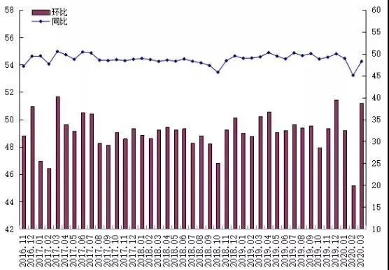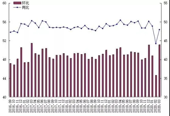 2020年3月,生产景气综合水平环比、同比均呈现上升态势,出口景气综合水平环比、同比均上呈现上升态势。各分项指数均位于荣枯线附近。从预期指数来看,未来可能会出现较高的景气程度。