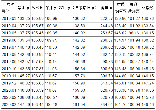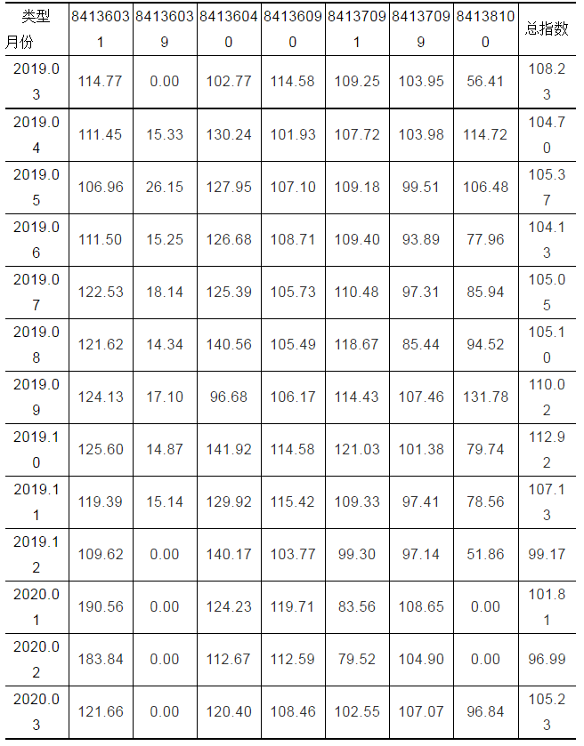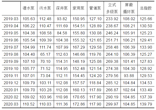 表1  温岭泵业出厂价格总指数与各分类指数(2020年03月)