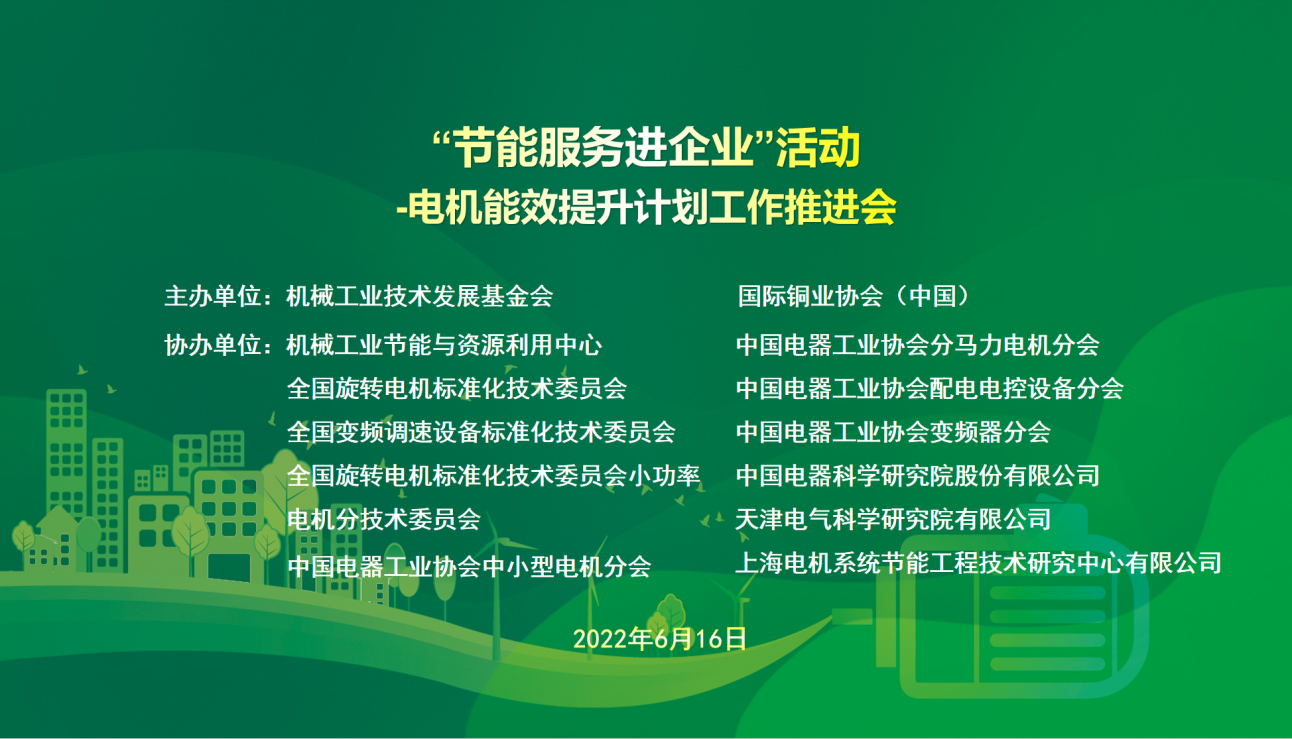 为宣贯《电机能效提升计划(2021-2023年)》(工信厅联节〔2021〕45号),加快高效节能电机推广应用,推进高效电机产业链补链强链,持续提升能源利用效率,近日机械工业技术发展基金会、机械工业节能与资源利用中心联合国际铜业协会(中国)通过网络视频会议形式举办了“节能服务进企业系列活动—电机能效提升计划工作推进会”。